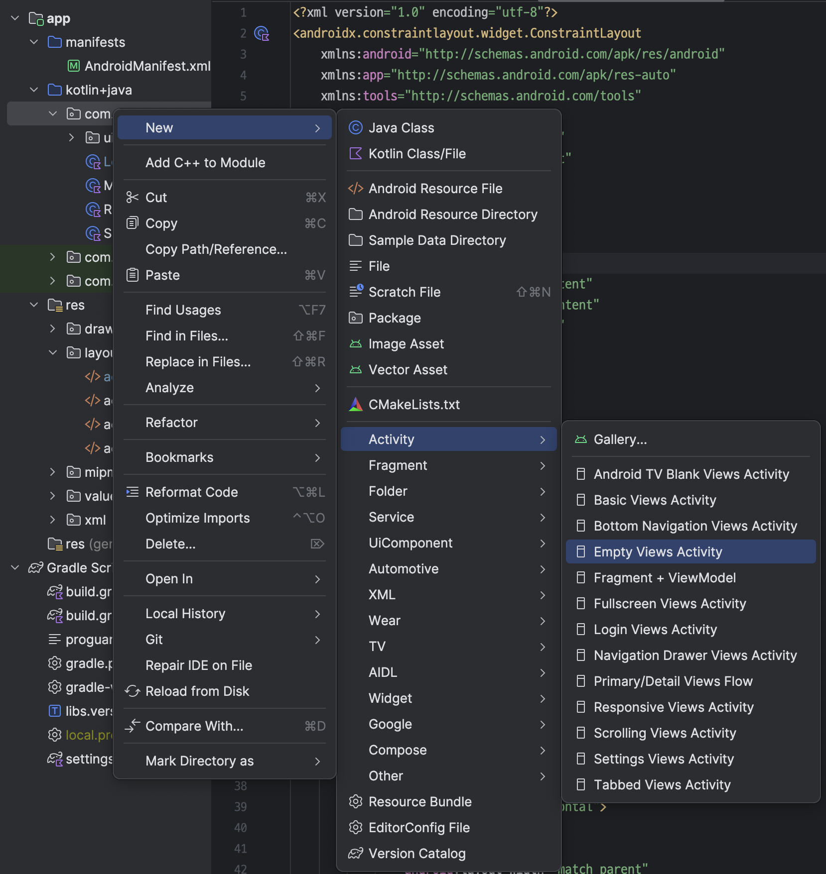 우선 Empty Views Activity를 하나 만들어주고 이름은 SplashActivity로 한다.